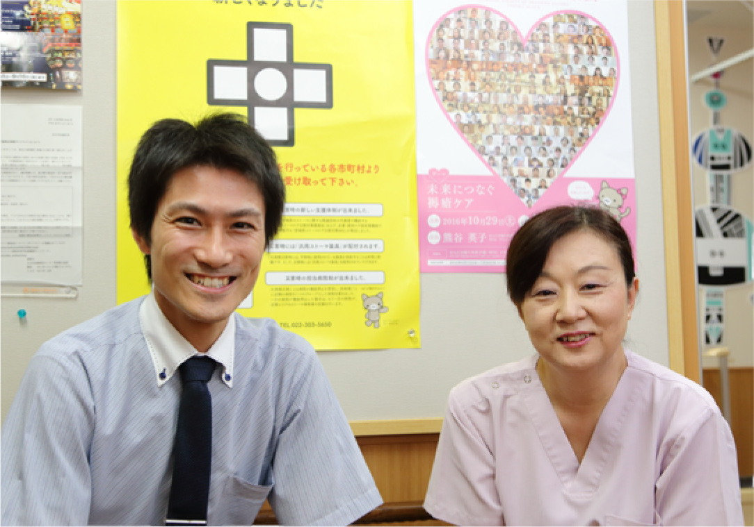 皮膚・排泄ケア認定看護師の熊谷英子統括看護部長(右)と小野寺紀文事務次長。
